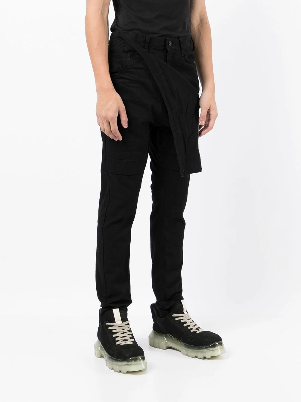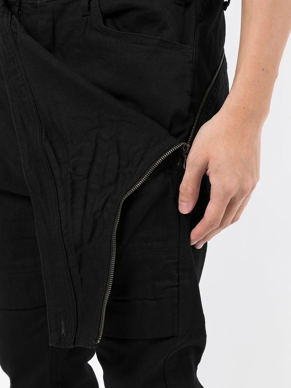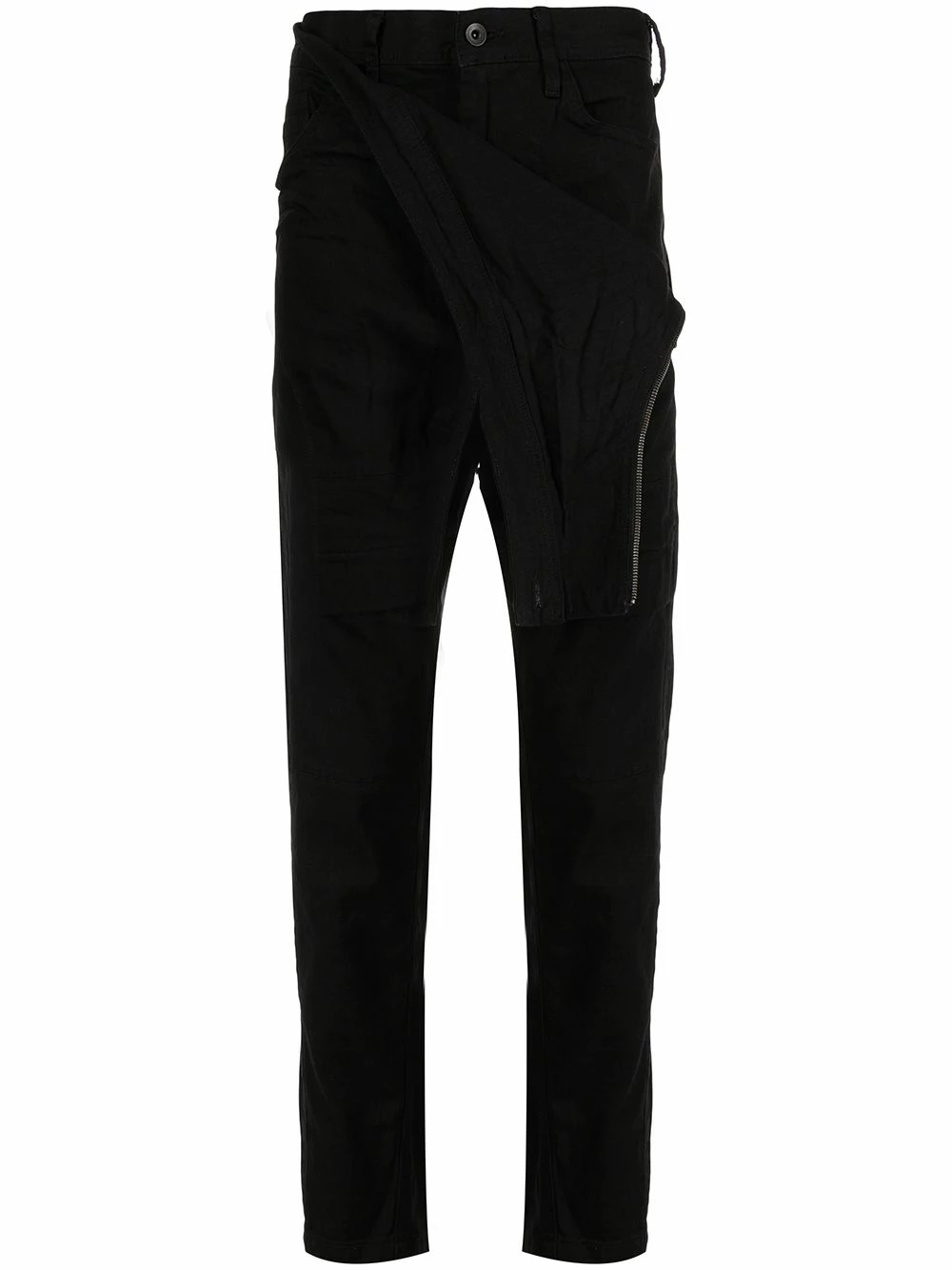 Coupe slim, coupe fuselée, fermeture boutonnée, passants de ceinture, cinq poches classiques, poche latérale zippée. Couleur : noir. Matière : coton mélangé.