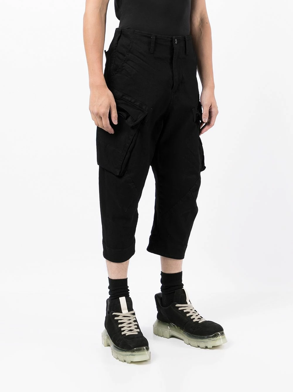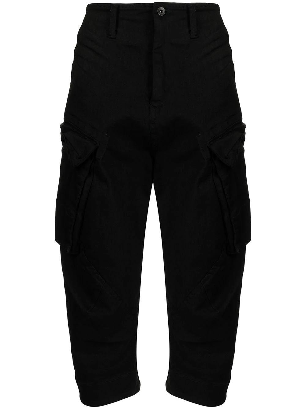 Poches cargo multiples, fermeture à zip et boutons sur le devant, passants de ceinture, longueur crop. Couleur : noir. Matière : coton.