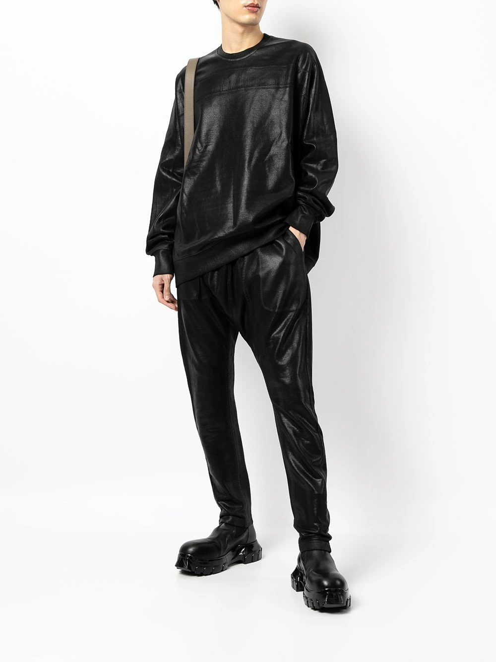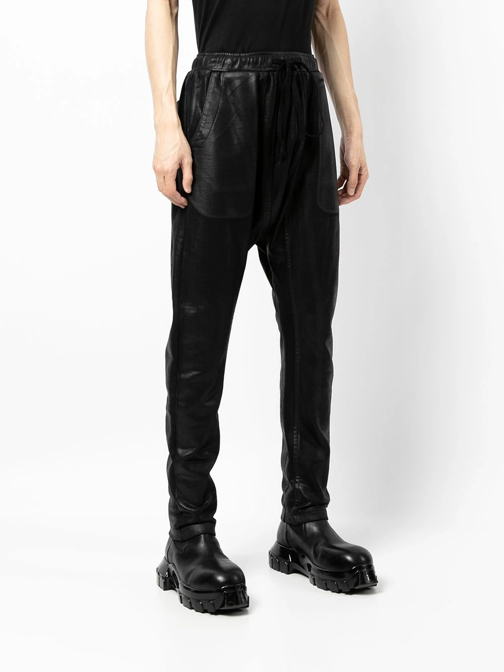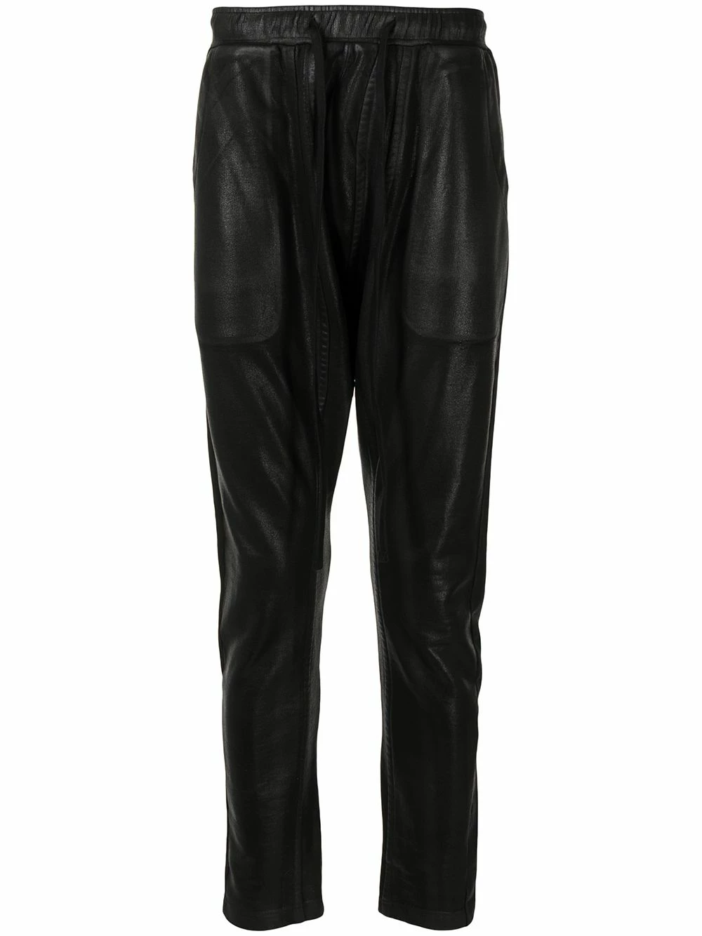 Fini verni, ceinture élastique, lien de resserrage à la taille, détails de coutures apparentes, deux poches latérales fendues, poches arriÚre plaquées. Couleur : noir. MatiÚre : coton.