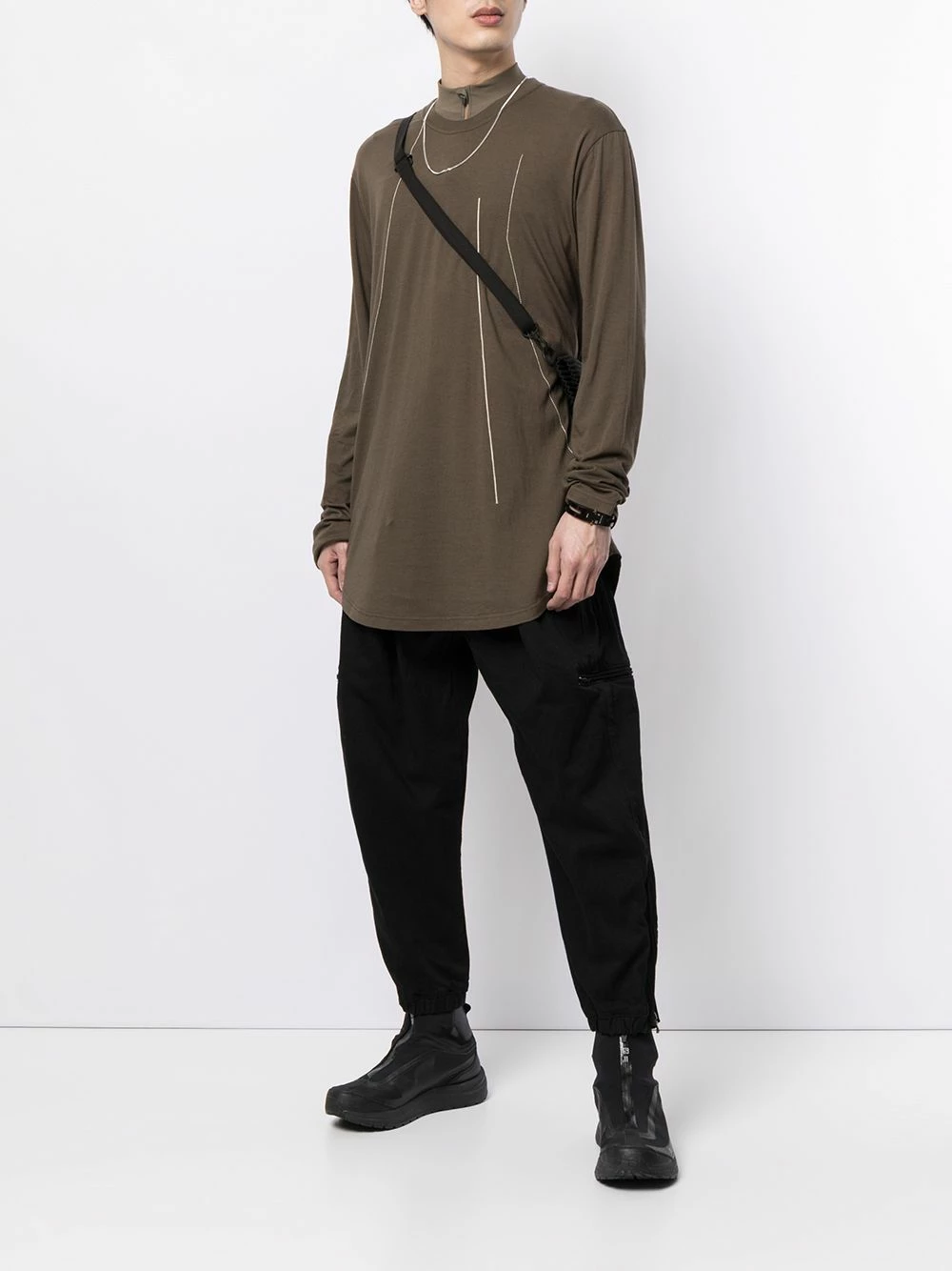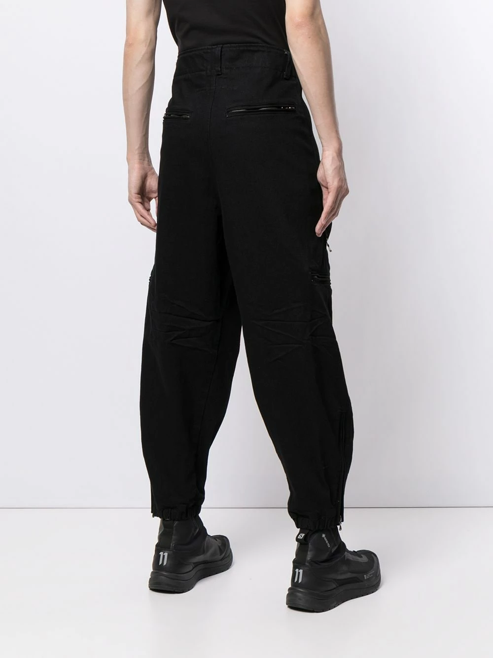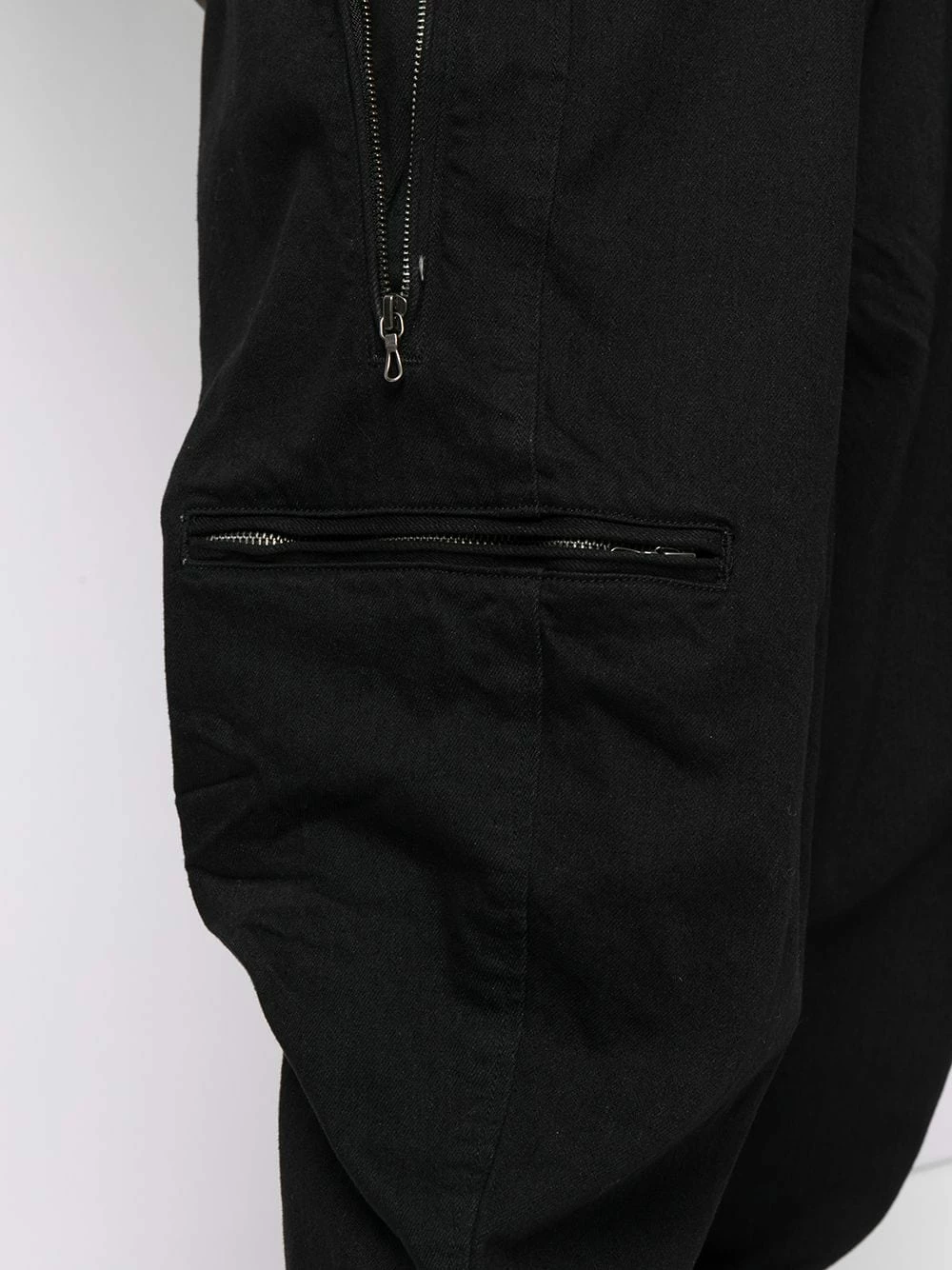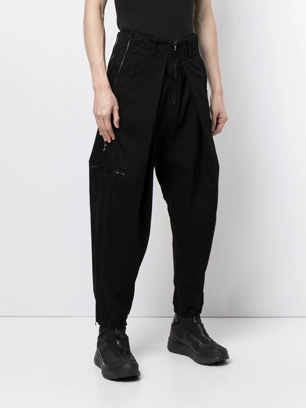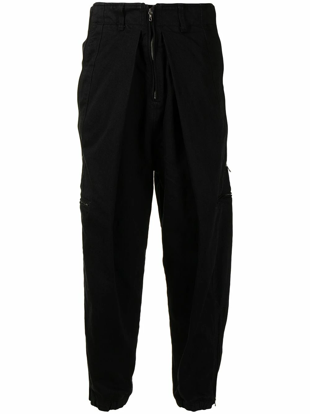 Plis creux, passants de ceinture, fermeture à zip et boutons sur le devant, poches latérales fendues, deux poches latérales zippées, deux poches arrière zippées. Couleur : noir. Matière : coton.