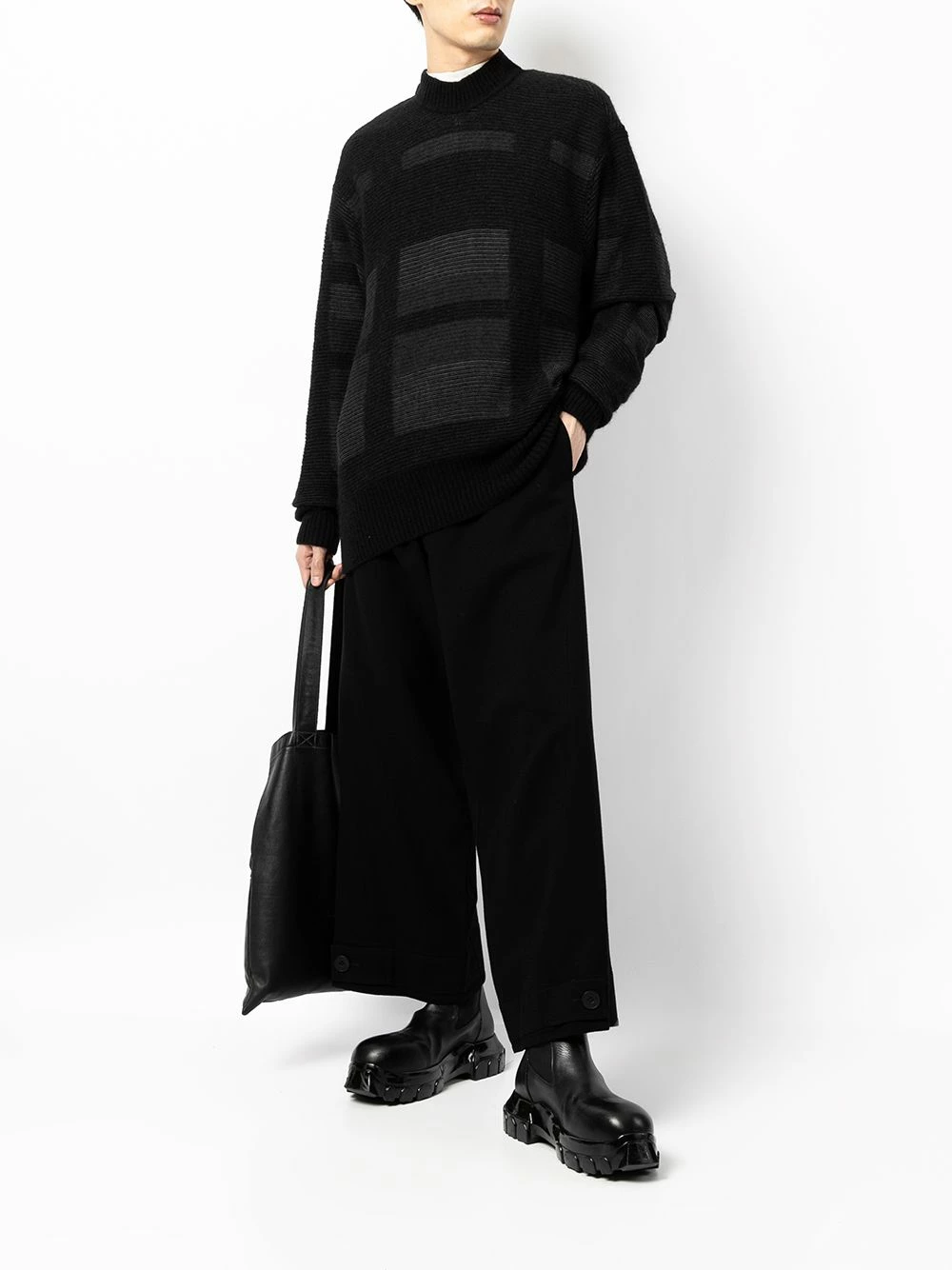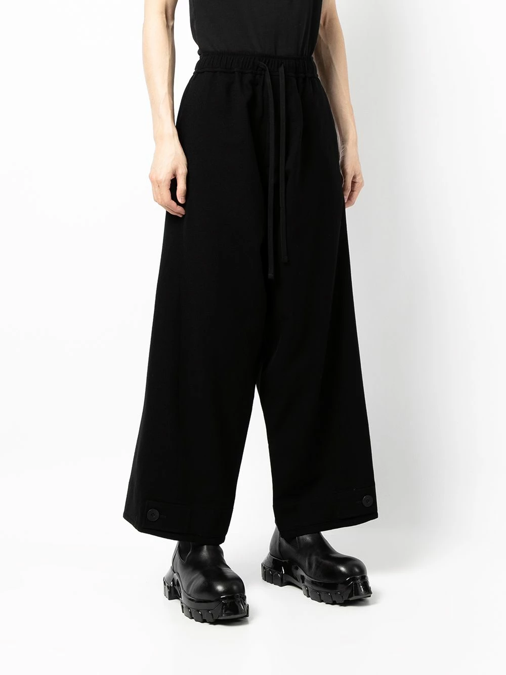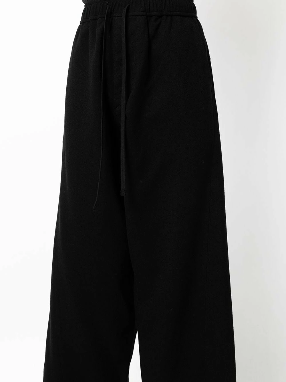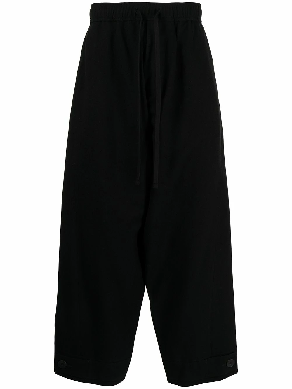 Ceinture élastique, taille à lien de resserrage, poignets boutonnés, coupe ample, deux poches latérales fendues, deux poches arrières boutonnées, entrejambe sarouel. Couleur : noir. Matière : laine.