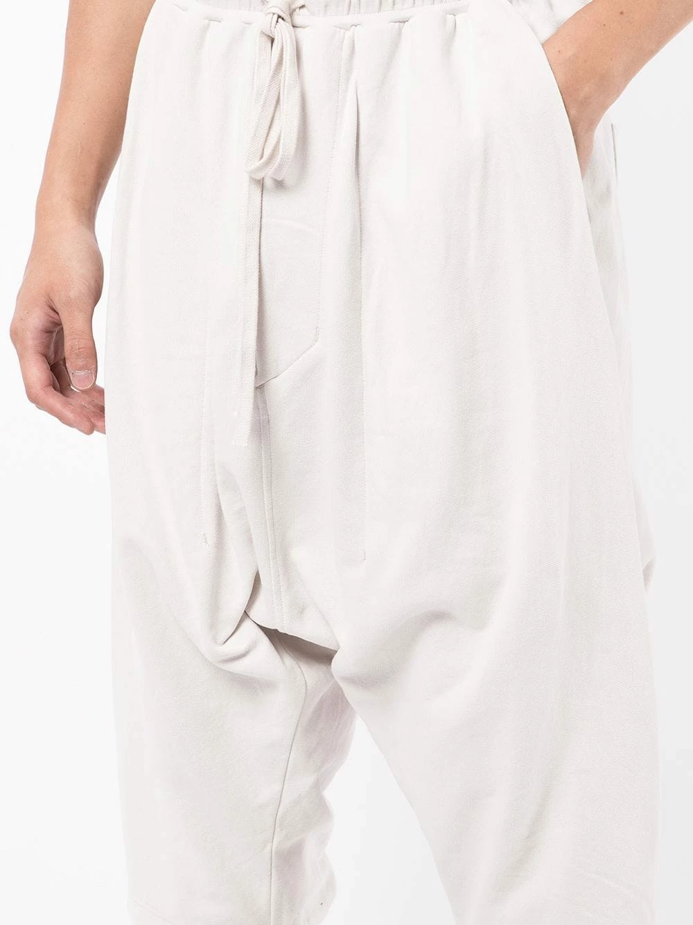 Poches arrière plaquées, entrejambe sarouel, lien de resserrage à la taille, longueur crop. Matière : coton.