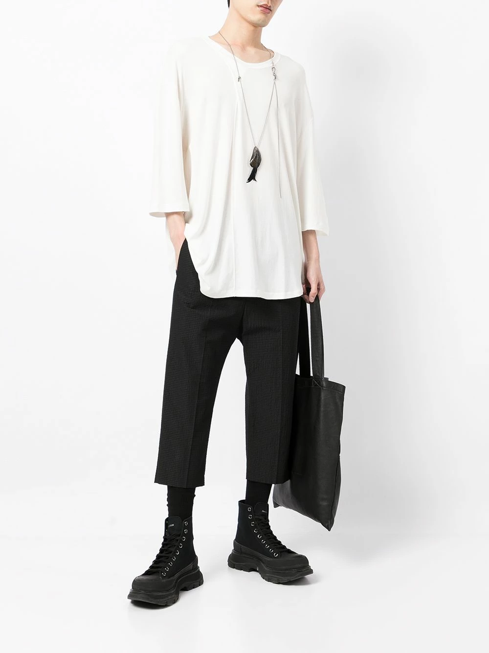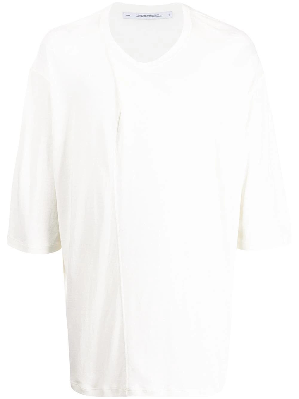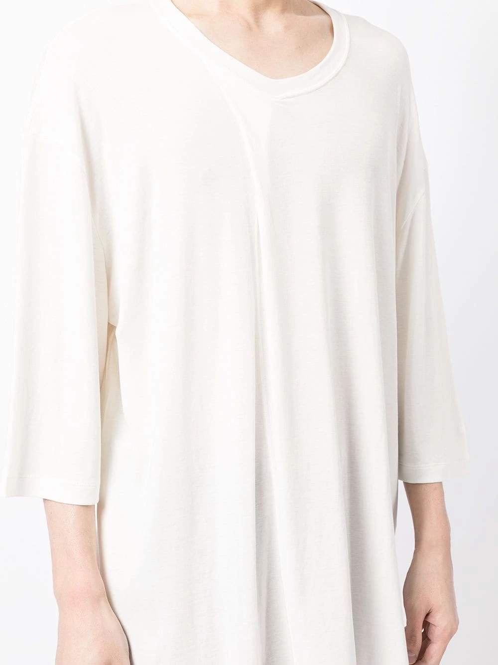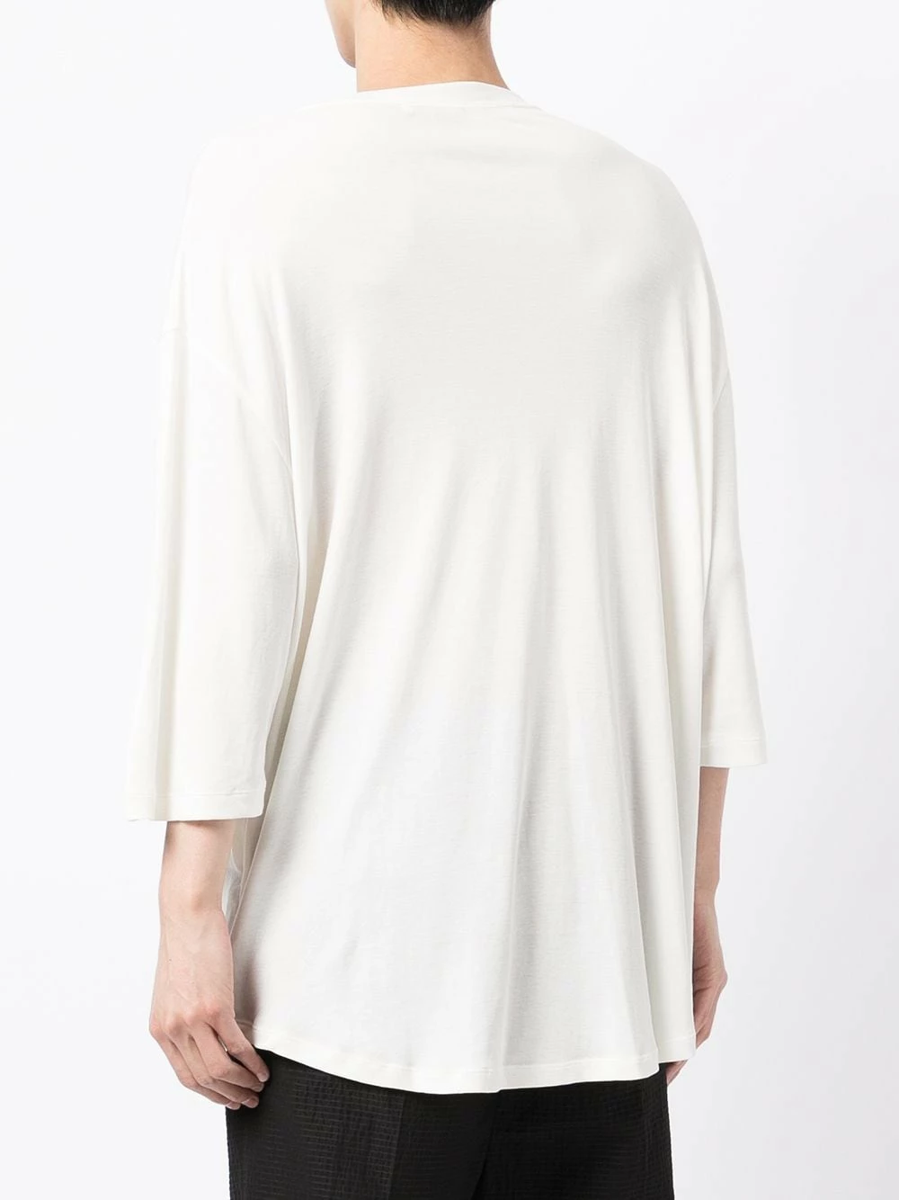 Design ton sur ton, encolure ras du cou, manches trois-quarts, ourlet asymétrique. Matière : coton.
