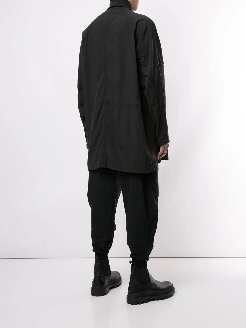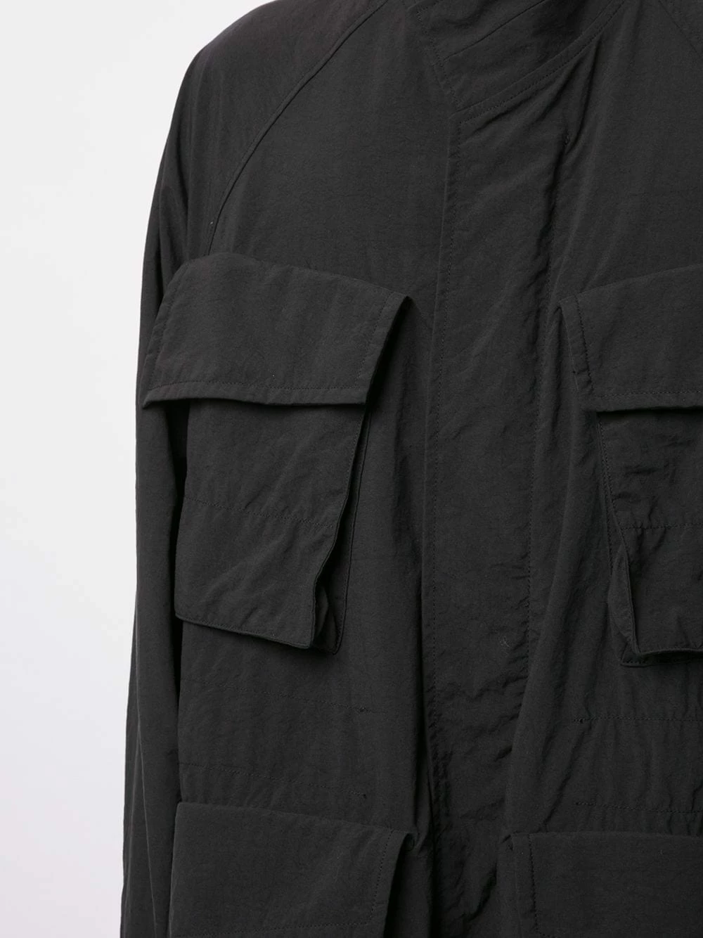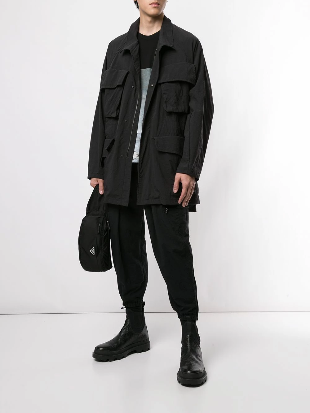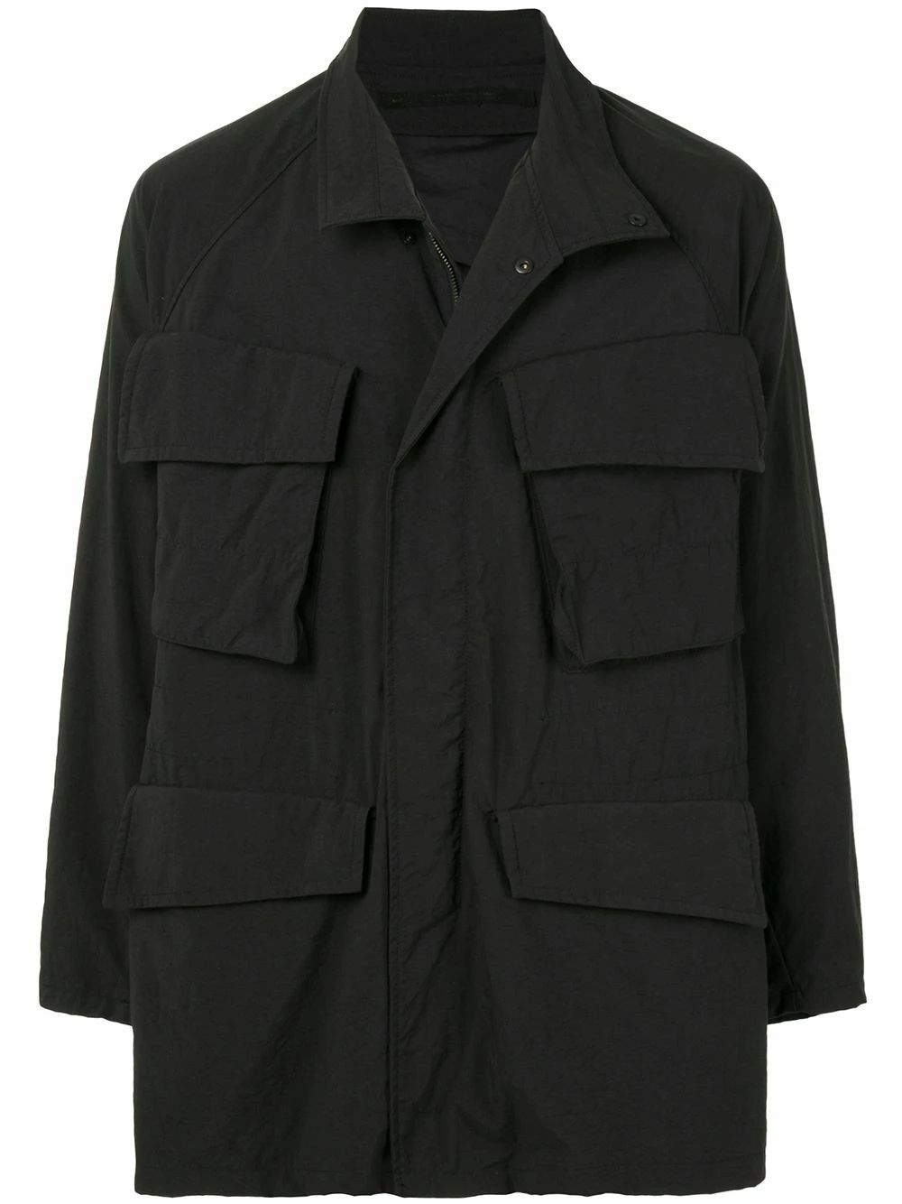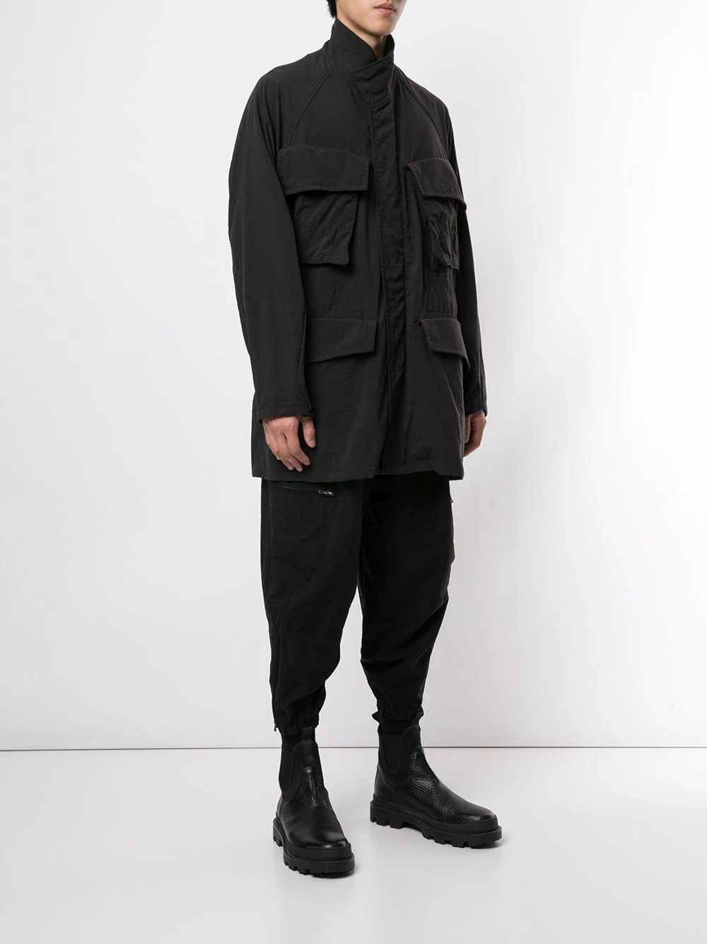 Poches latérales cargo, col italien, fermeture dissimulée sur le devant, manches longues, coupe mi-longue. Couleur : noir.