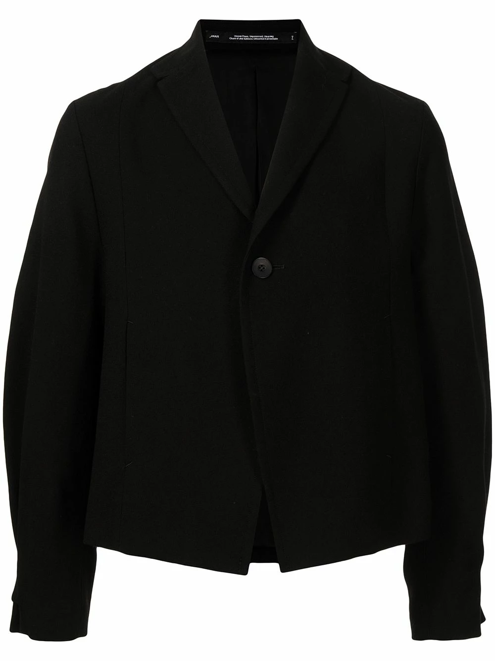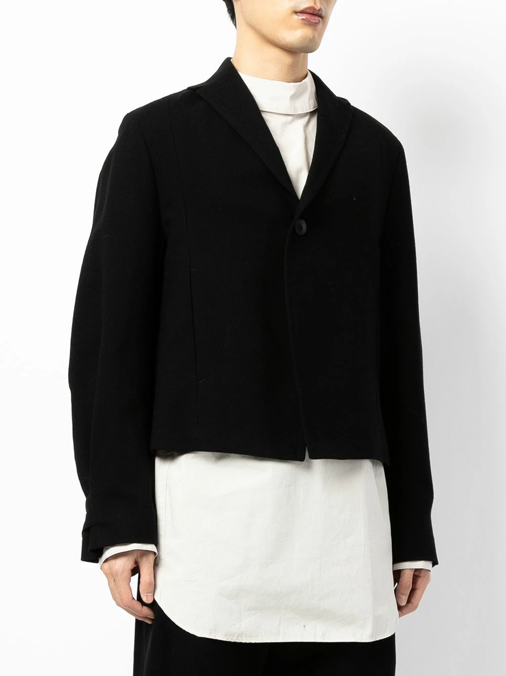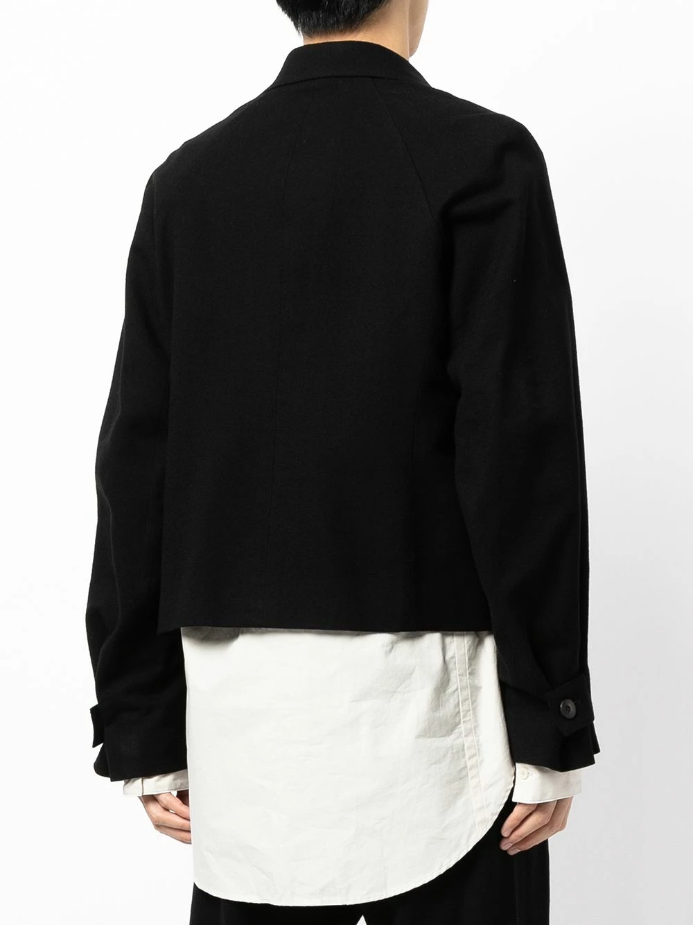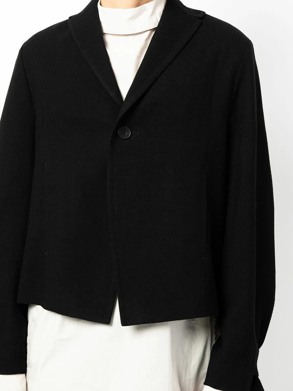 Coupe courte, col v, manches longues, boutonniÚre sur le devant, poignets boutonnés, deux poches latérales fendues. Couleur : noir. MatiÚre : laine.