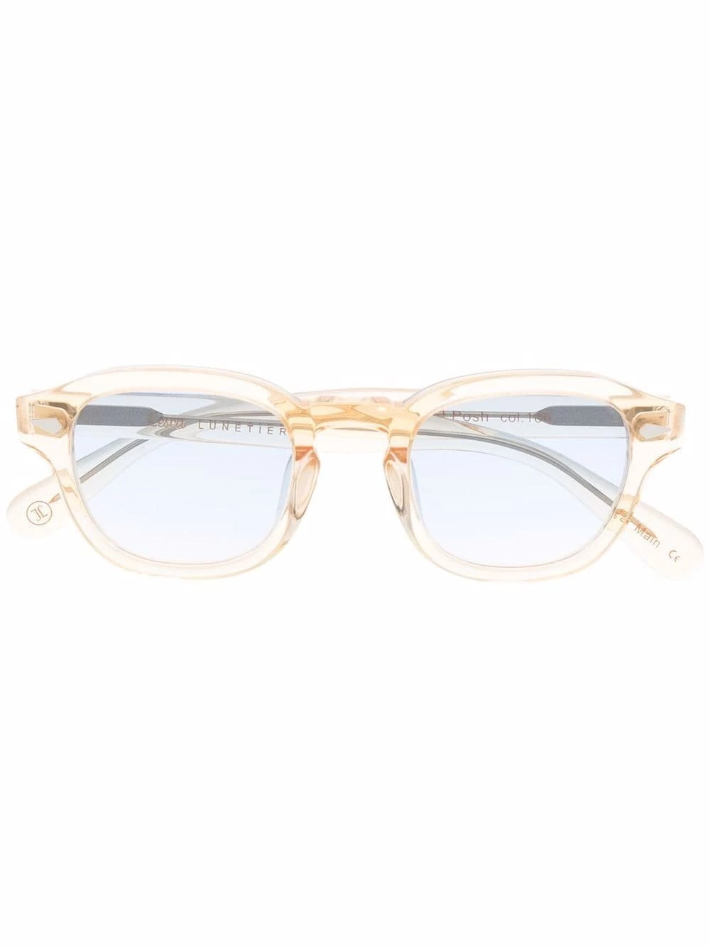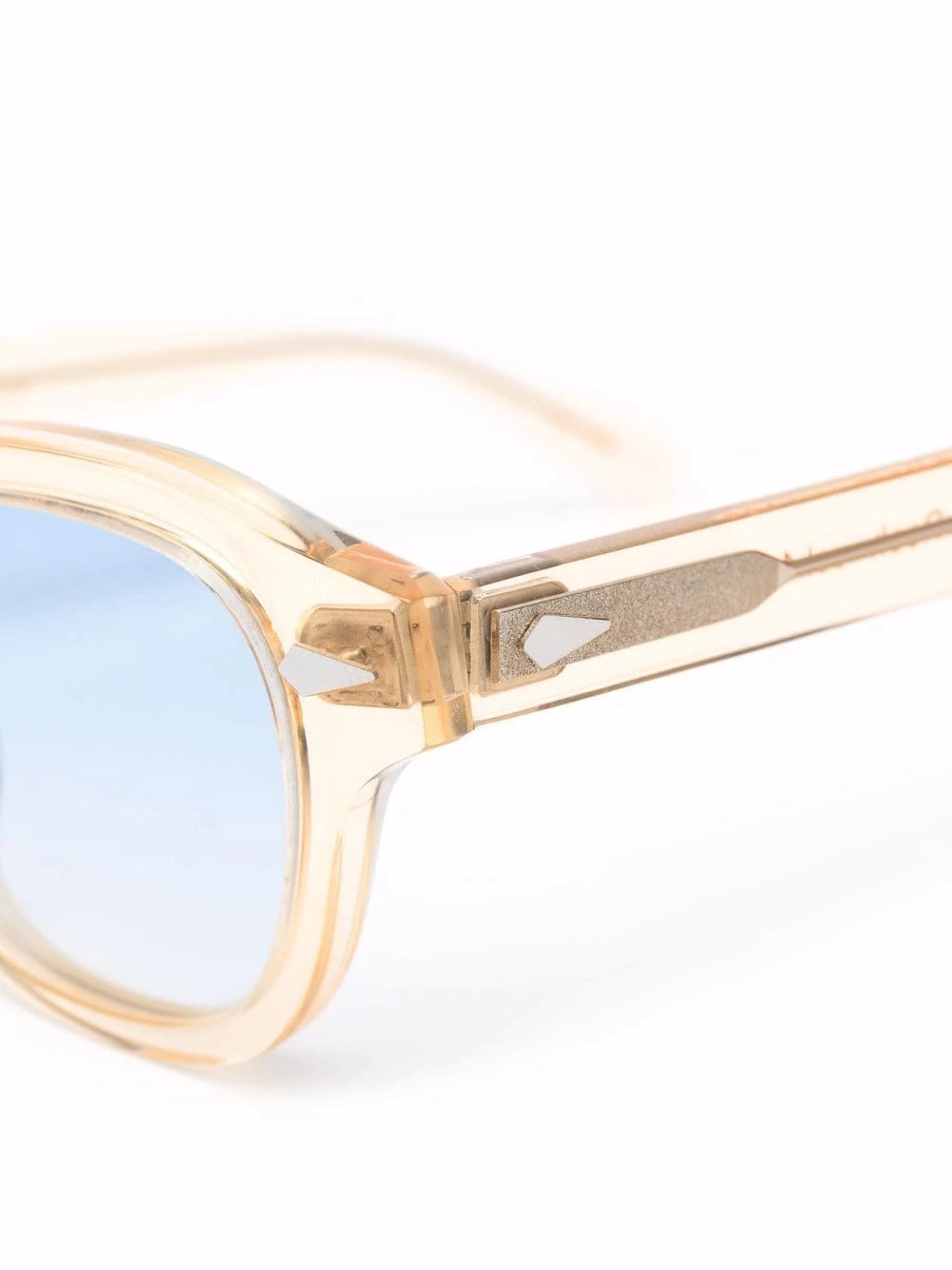 Monture carrée, monture à effet de transparence, verres teintés bleus.
