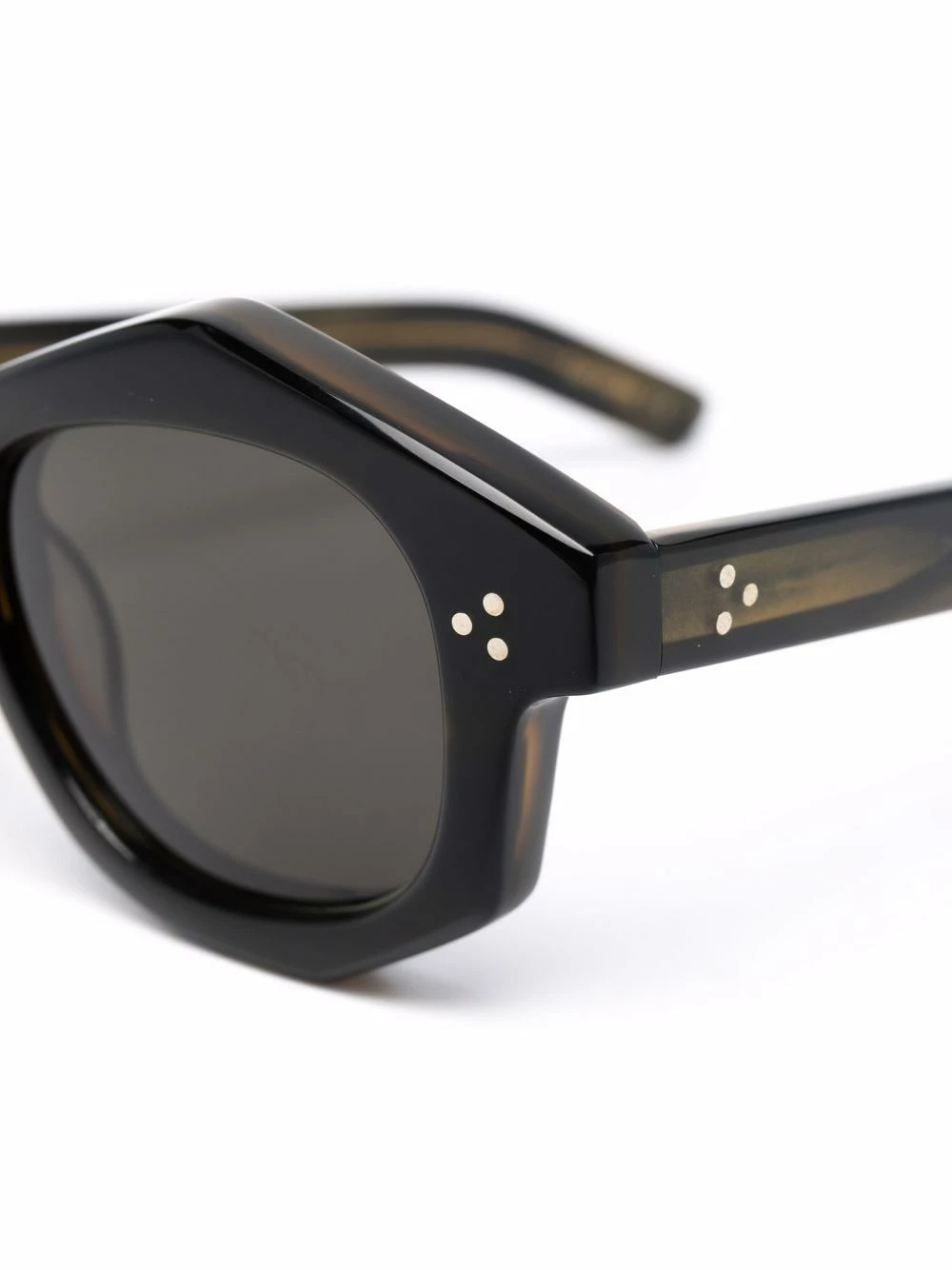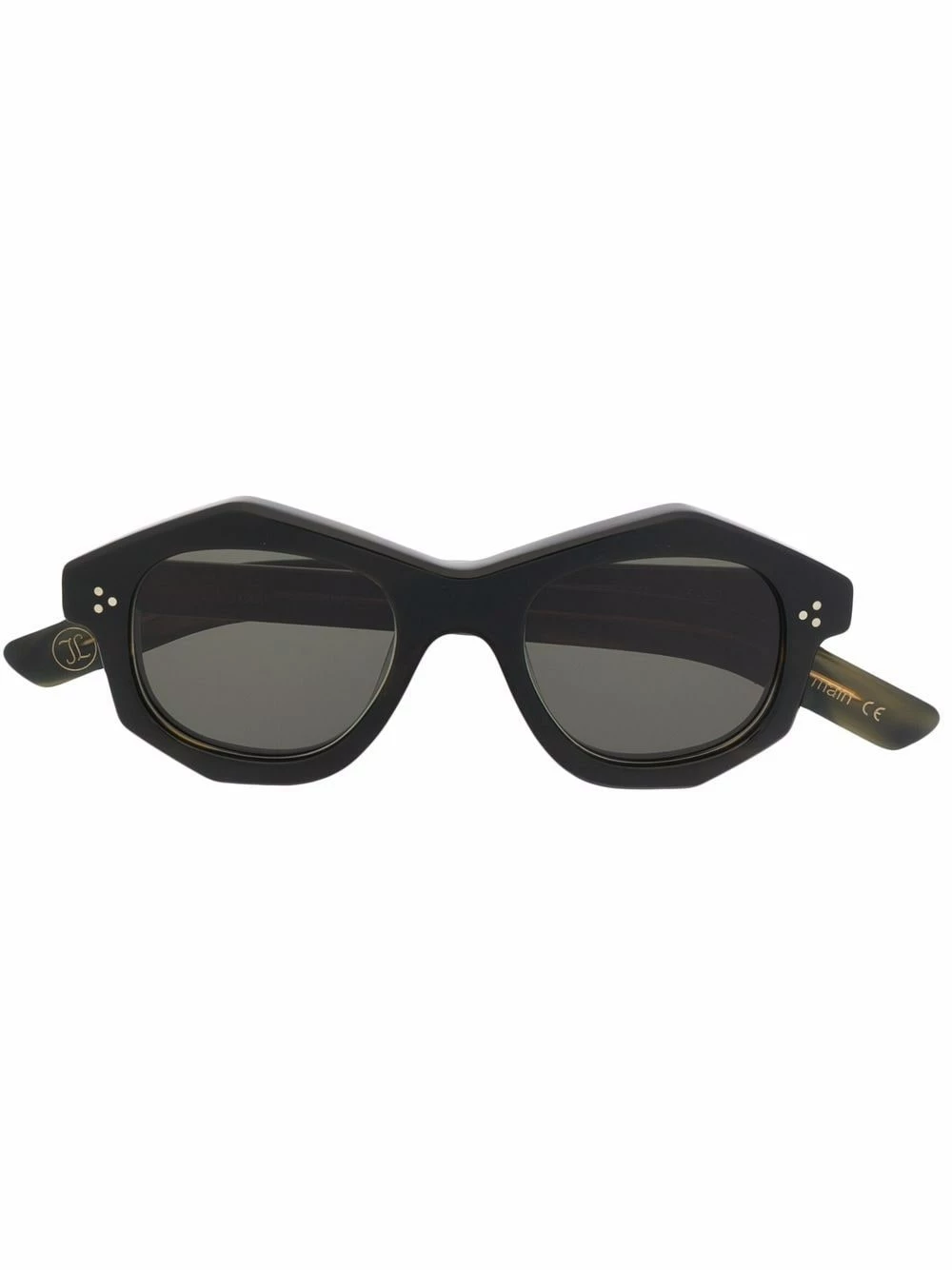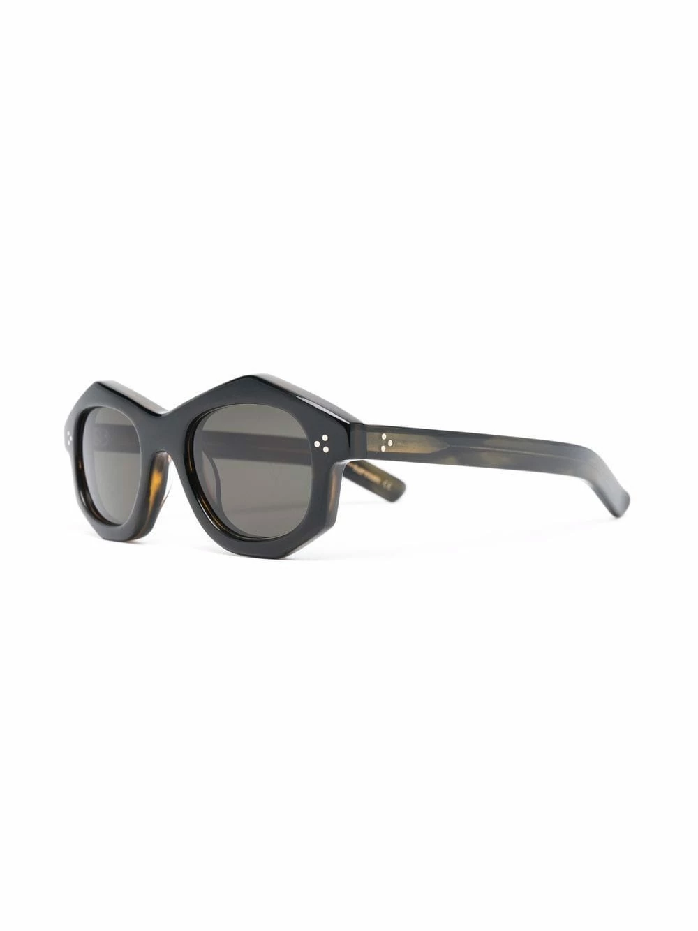 Monture géométrique, verres teintés, branches droites, extrémités incurvées. Couleur : vert.