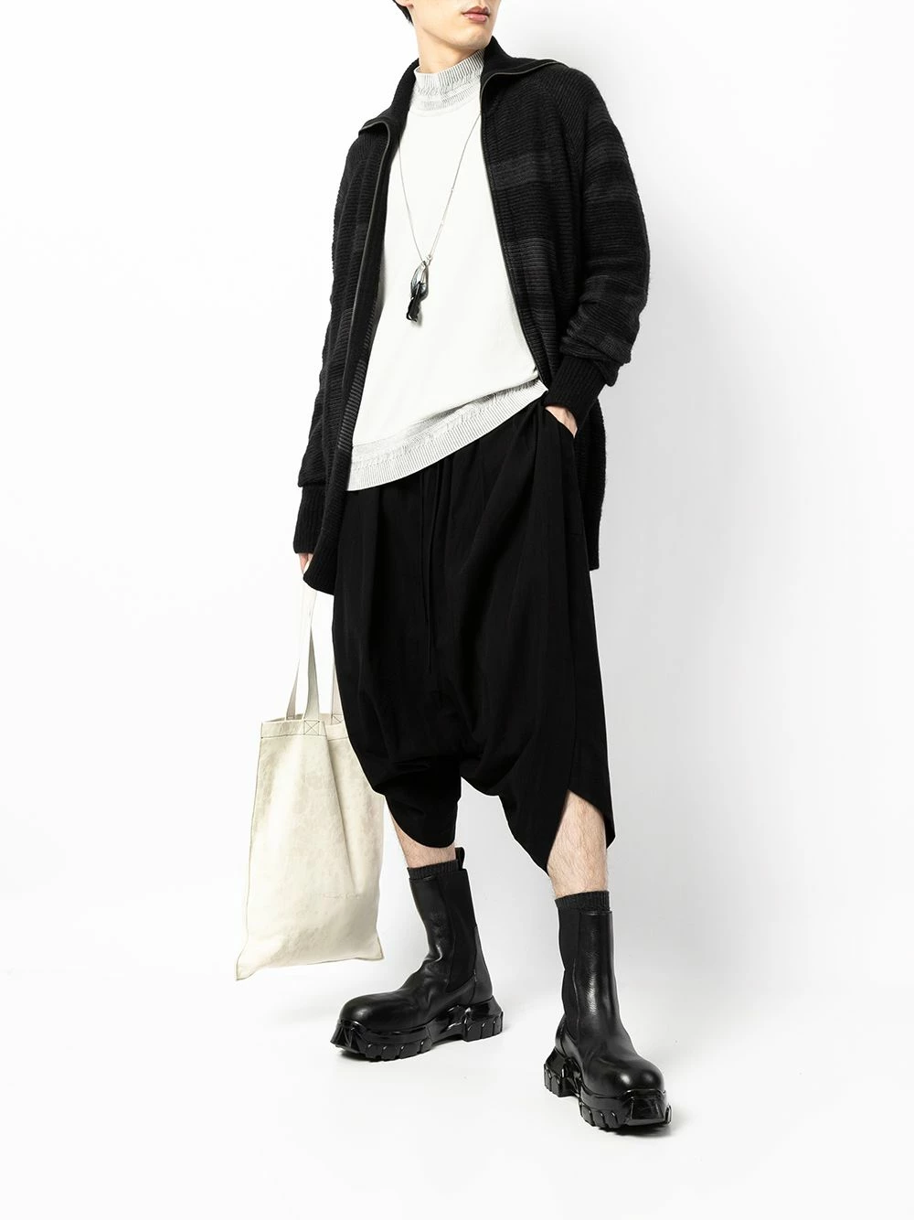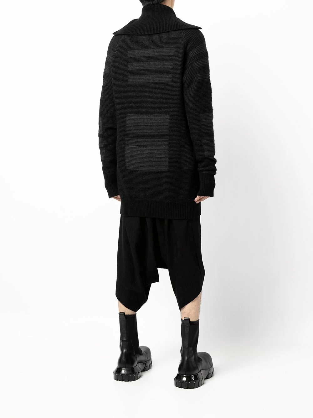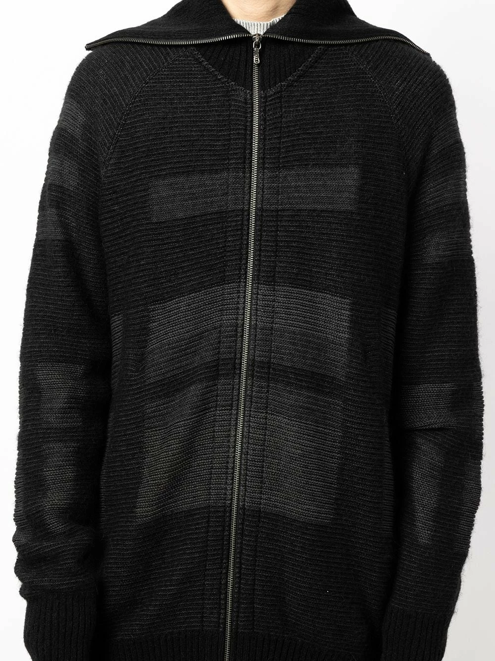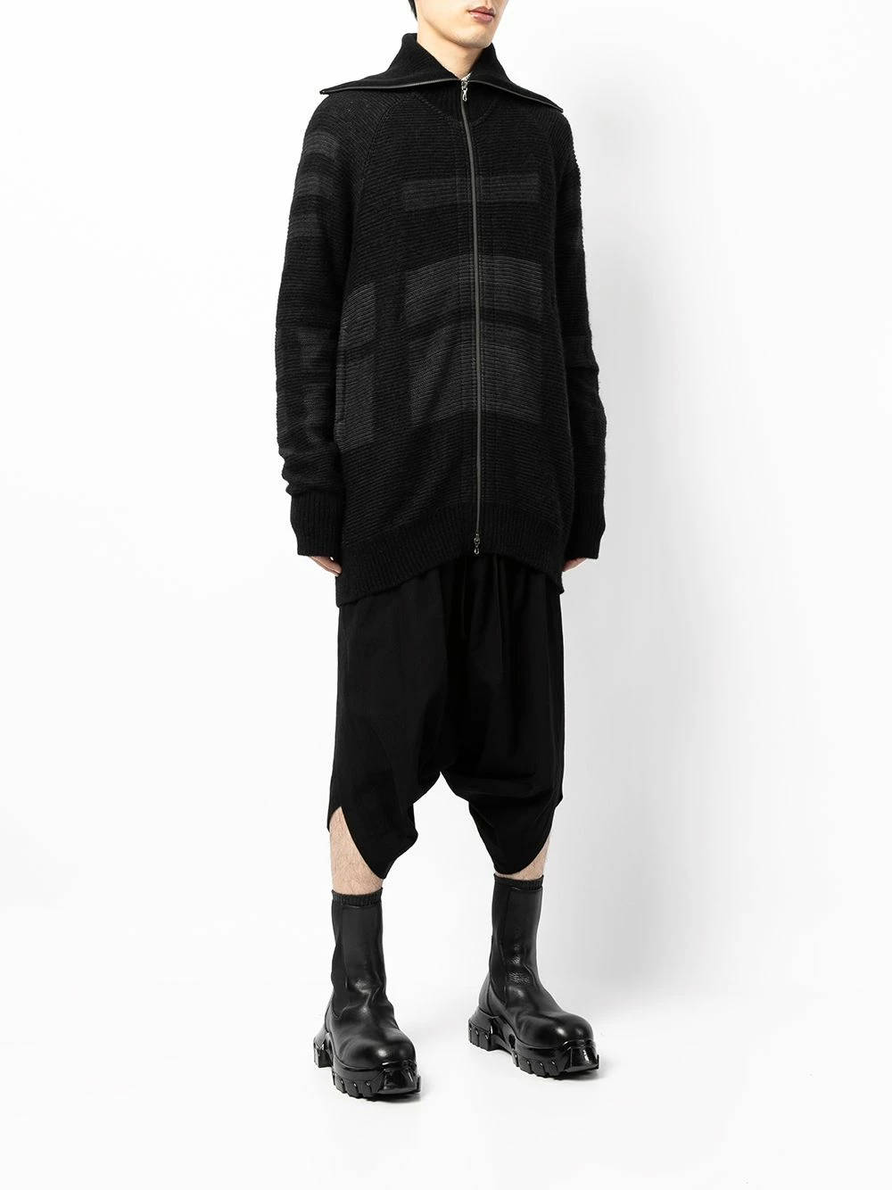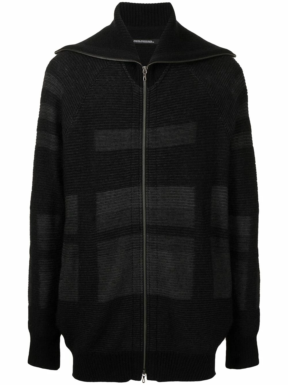 Motif géométrique, modèle bicolore, fermeture zippée devant, col montant, manches extra-longues, finitions nervurées. Couleur : noir. Matière : alpaga.