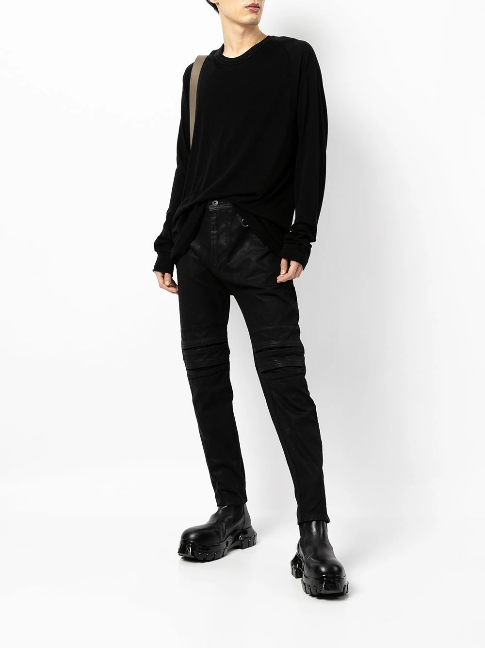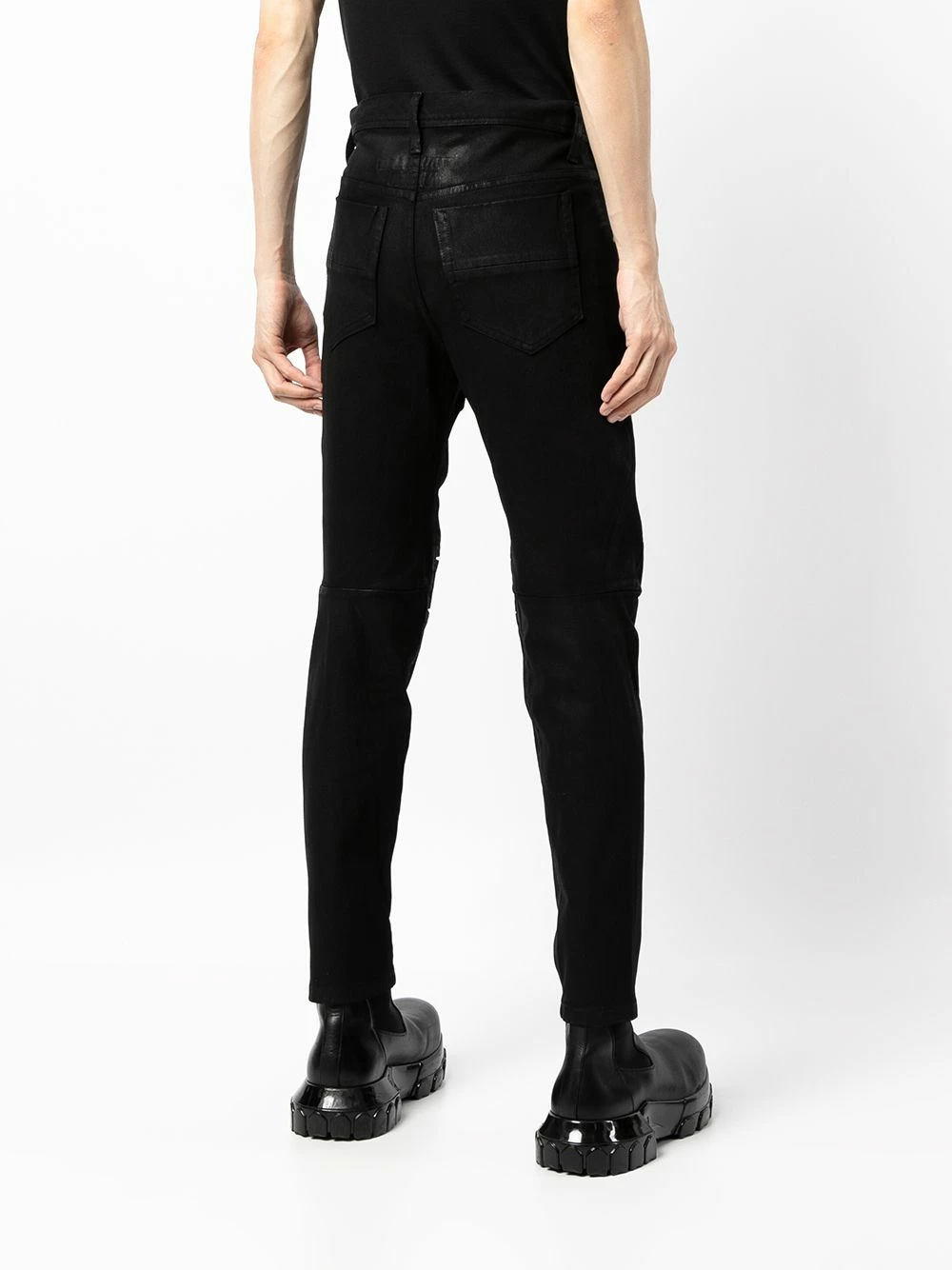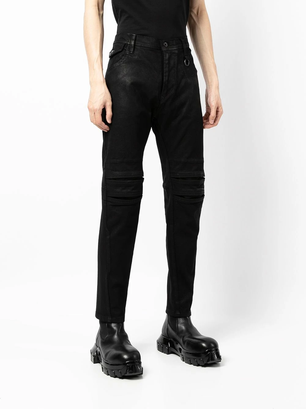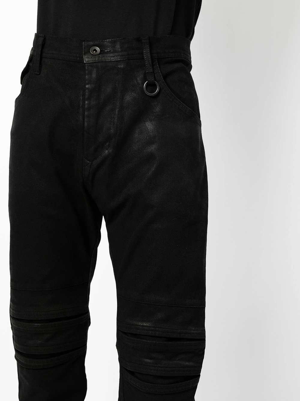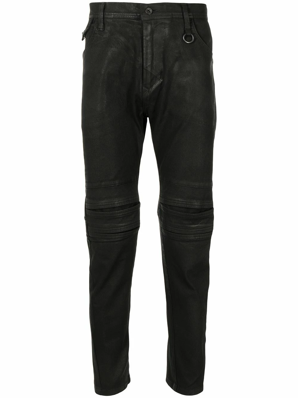 Fini verni, passants de ceinture, fermeture boutonnée, poches latérales arrondies, poches arrière plaquées, coupe slim. Couleur : noir.