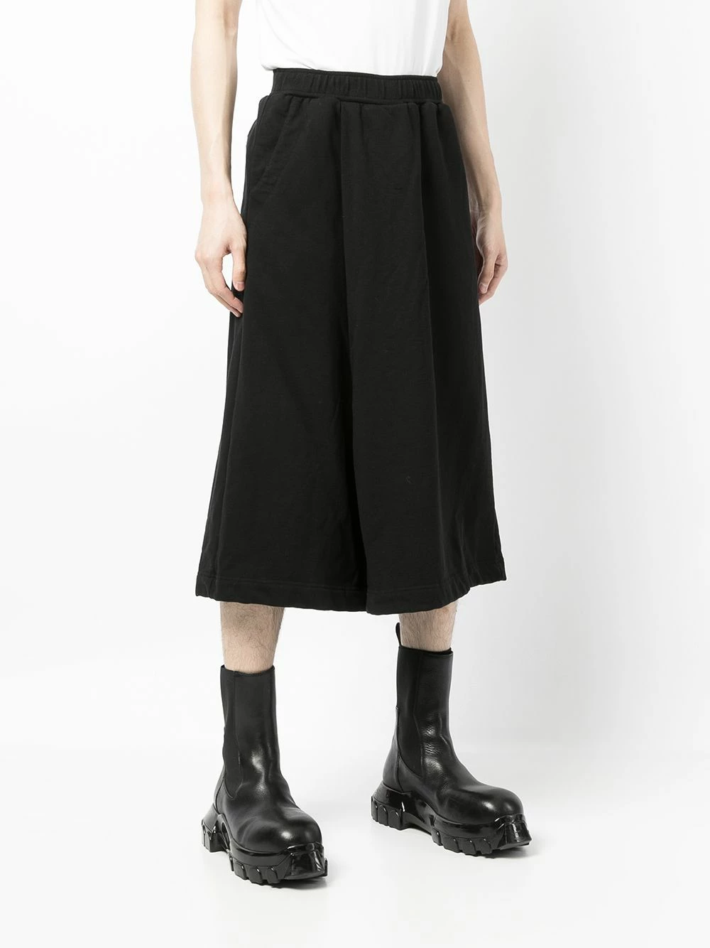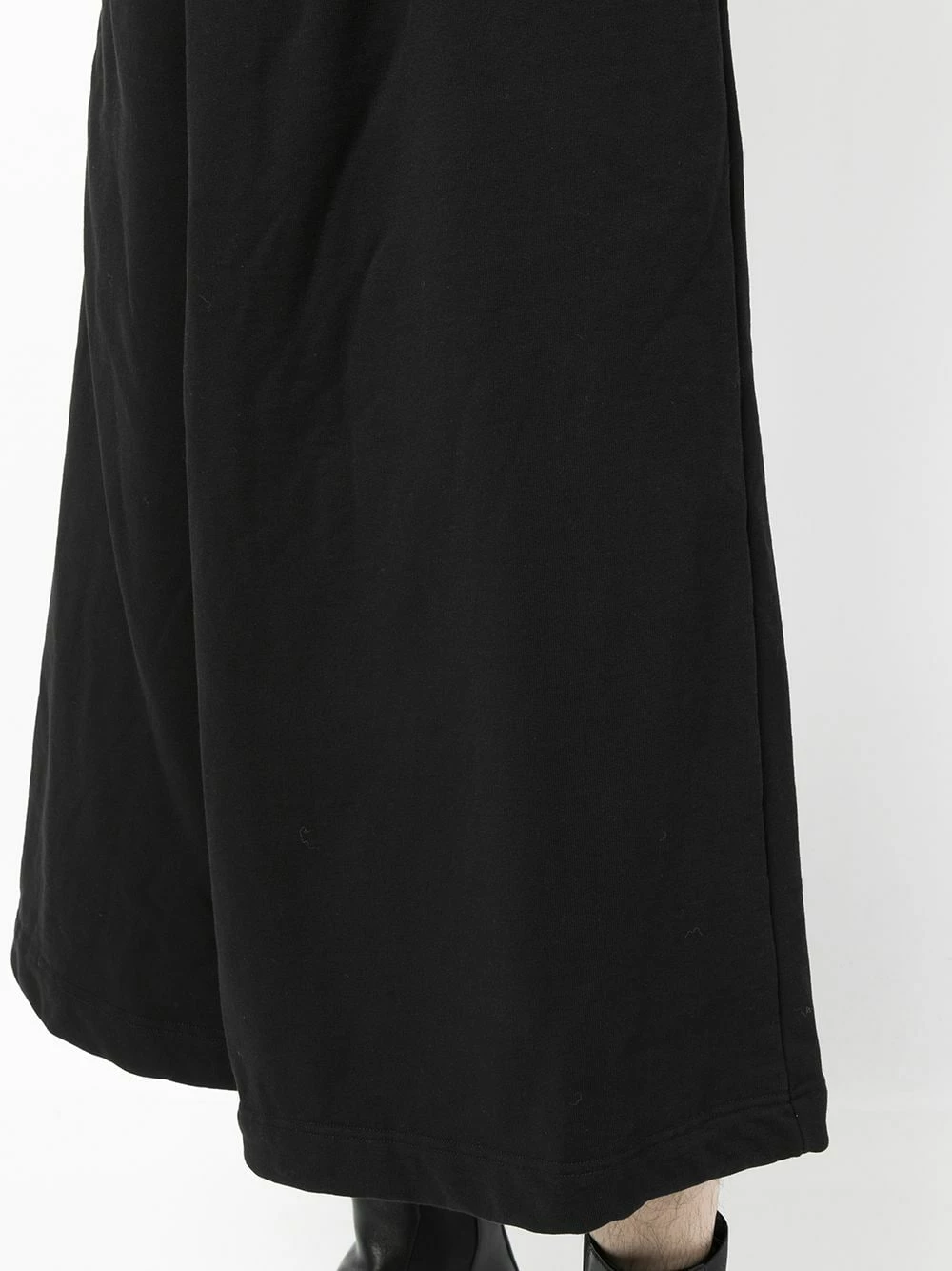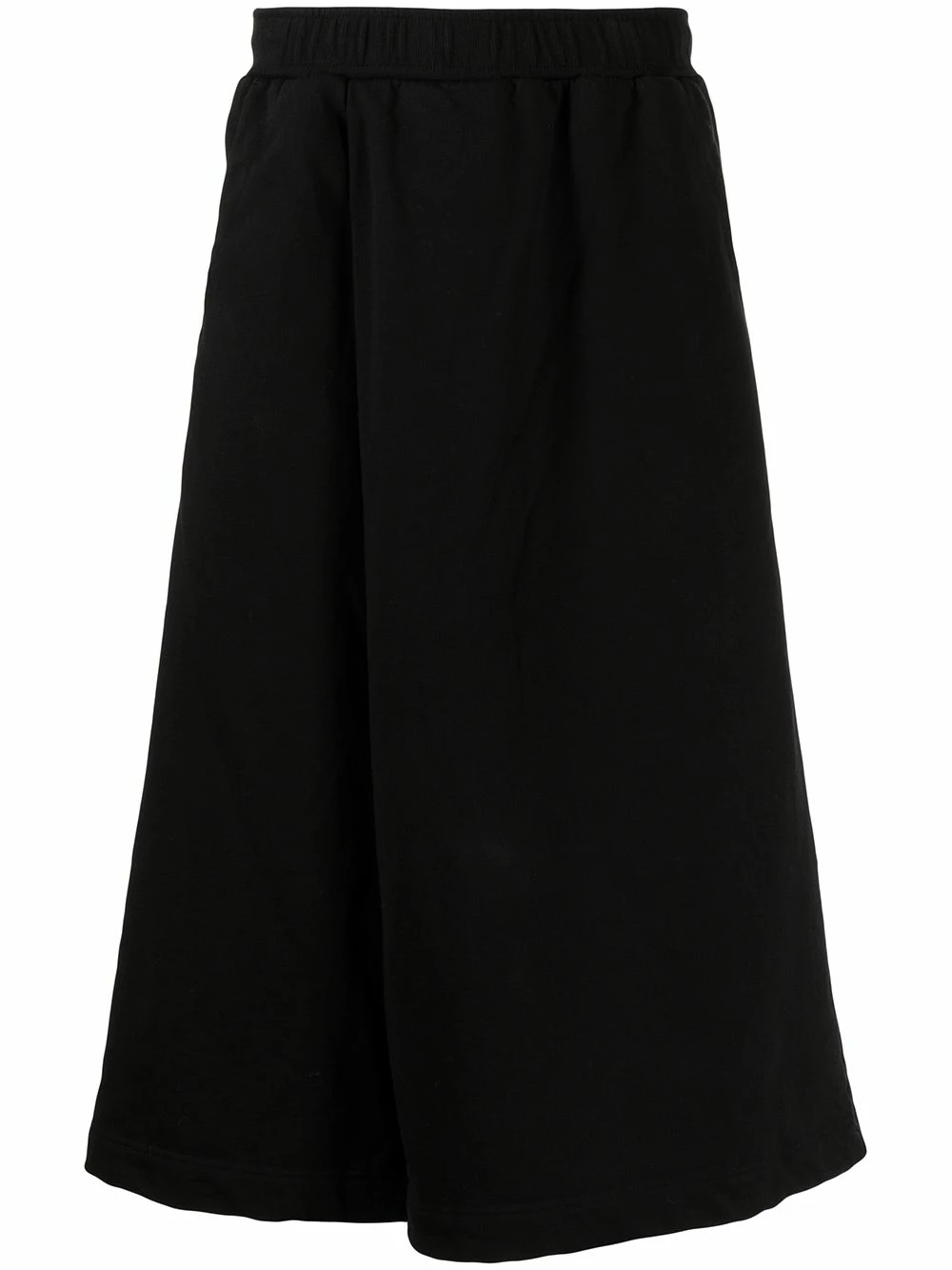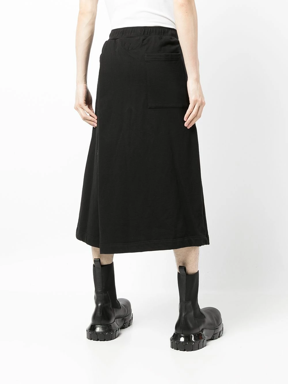 Taille haute, ceinture élastique, poche latérale passepoilée, poche arrière plaquée, design drapé, hauteur genou. Couleur : noir. Matière : coton.