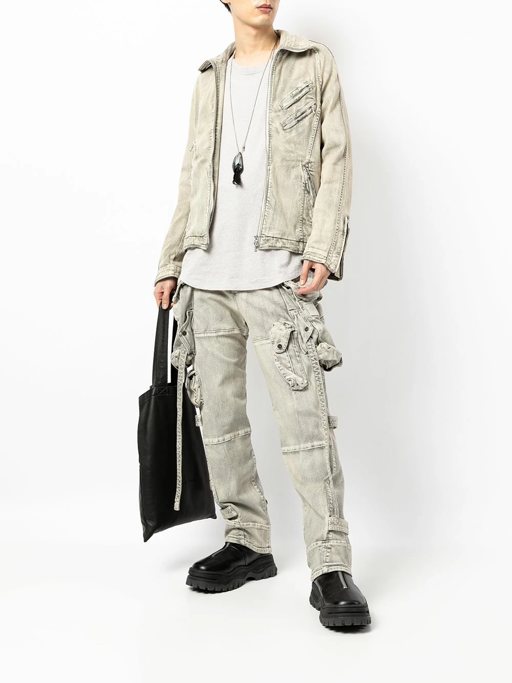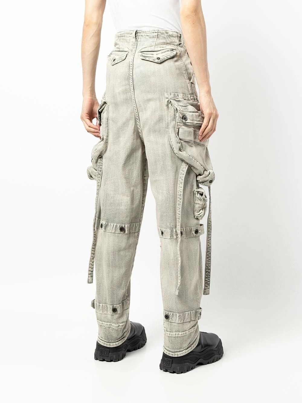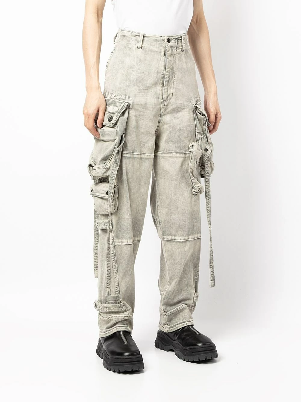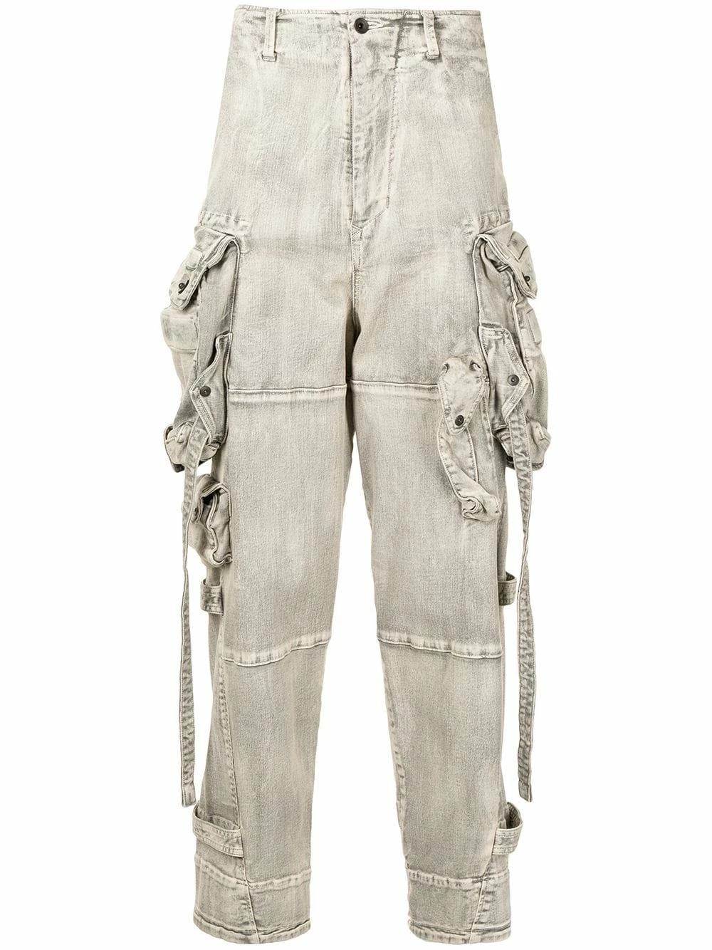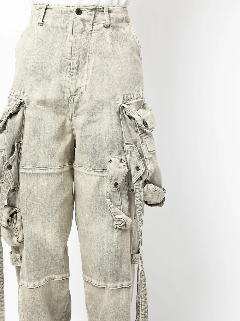 Effet délavé, passants de ceinture, fermeture boutonnée, poches cargo multiples, poches latérales fendues, poches arriÚre à rabat.