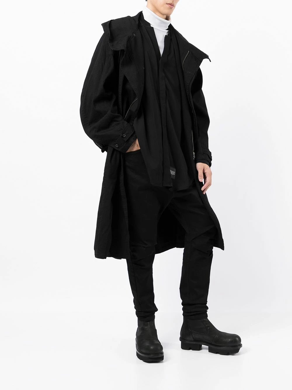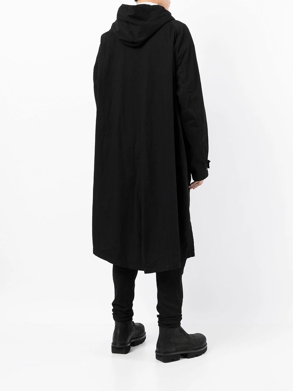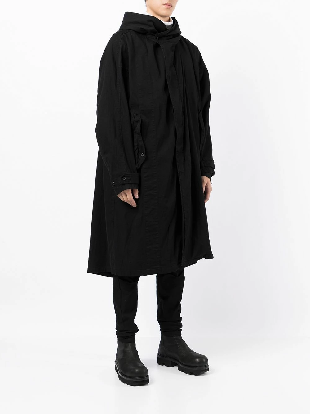 Design drapé, capuche classique, fermeture dissimulée sur le devant, manches longues. Couleur : noir. Matière : coton.